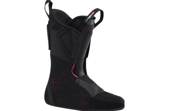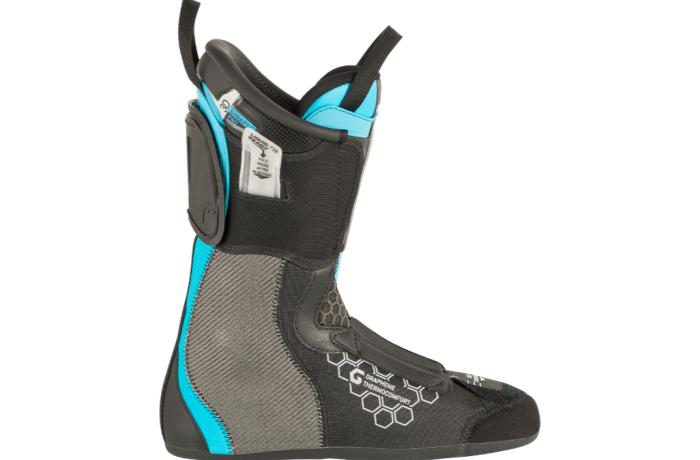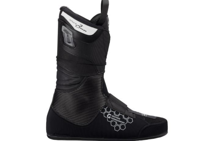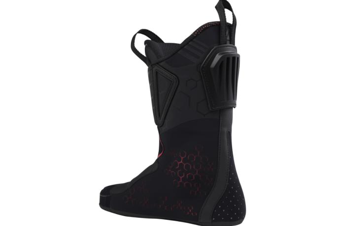 The Auxetic liner is marked (literally) by hexagonal, etched cuts in the exterior material which can expand slightly to allow for point-specific stretch points around bony or wide spots. The result is less peak tension points in those areas which makes for a shockingly even and comfortable feel without a packed-out or loose sensation. Some testers mistake the lack of hotspot pressure as general looseness until they ski the boot and feel held in place, just comfortably so.